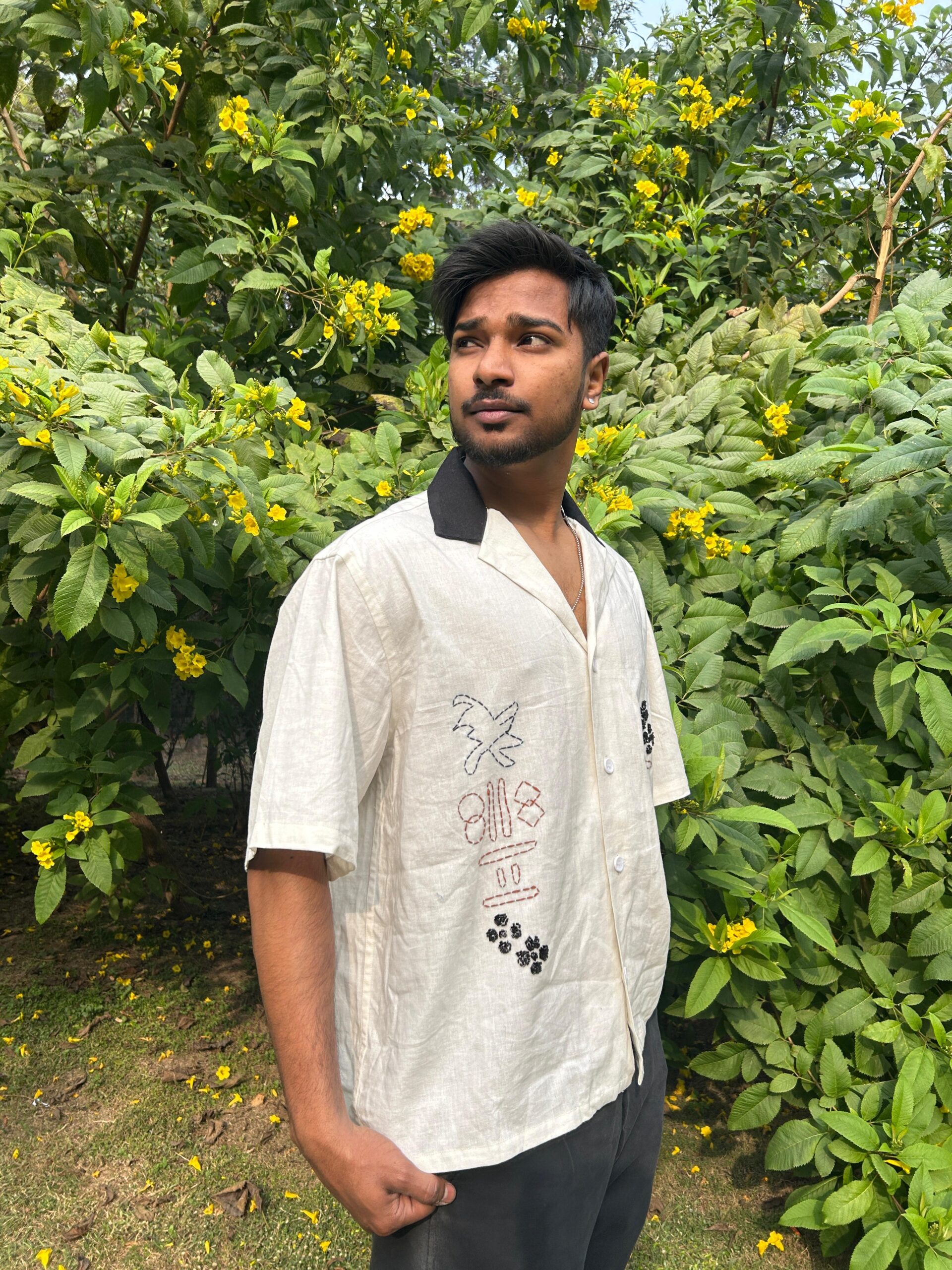 This off-white short-sleeve shirt features a relaxed silhouette with a contrast collar and subtle hand-drawn inspired detailing. Made from lightweight, breathable fabric, it delivers effortless comfort with an artistic edge. Perfect for summer days, casual outings, and vacation moods—easy, expressive, and timeless.